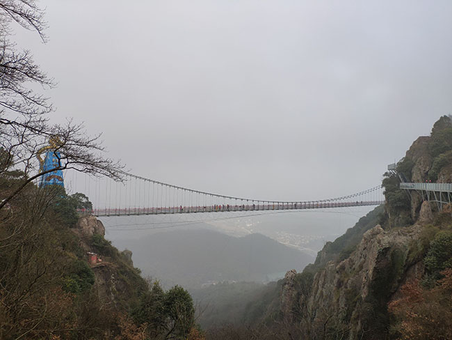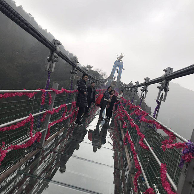“飛龍玻璃橋”全長(zhǎng)388米,垂直高度180米,橫跨馬仁奇峰太陽(yáng)山與主峰之間,連接天梯玻璃棧道共同組成了一個(gè)高空體驗(yàn)觀景勝地。從遠(yuǎn)處看,兩條巨龍盤(pán)踞在玻璃橋兩端,橋下萬(wàn)株楠木,宛如一幅“飛龍?zhí)鞓蚩撮!钡慕^妙畫(huà)卷。
