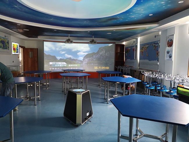 環(huán)幕示教系統(tǒng)位于教室后方,占據(jù)一整塊墻面,強大的視覺沖擊牢牢抓住學(xué)生的視線。以曲面投影顯示形式,播放宇宙與地球,地質(zhì)災(zāi)害等視頻資料,還可用于3S教學(xué)及課外科普影片的播放。用于教學(xué)的課程導(dǎo)入,每每都能起到事半功倍的效果,為整堂課的教學(xué)開個好頭。