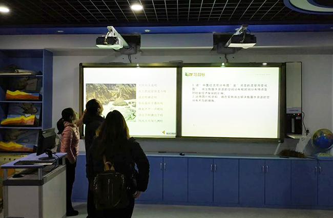 教室內(nèi)的數(shù)字化設(shè)備均可由學(xué)生自主操作學(xué)習(xí),其中多媒體超半球互動(dòng)球幕投影演示儀,可以非常形象、全方位的展示球體教學(xué)內(nèi)容,既可以演示宇宙中各天體和星體,也可以演示各種地理知識(shí),把枯燥單調(diào)的地理教學(xué)變得形象、直觀、生動(dòng)鮮活,把抽象問題具象化。