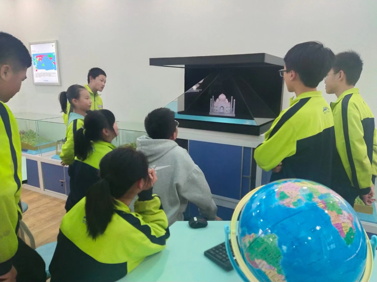 三間教室均配有數(shù)字立體地形、多點(diǎn)觸控多媒體球幕投影演示儀、天文演示儀以及數(shù)字模型等設(shè)備。學(xué)校老師精于鉆研,很快便能熟練使用各設(shè)備,并應(yīng)用于日常教學(xué)。