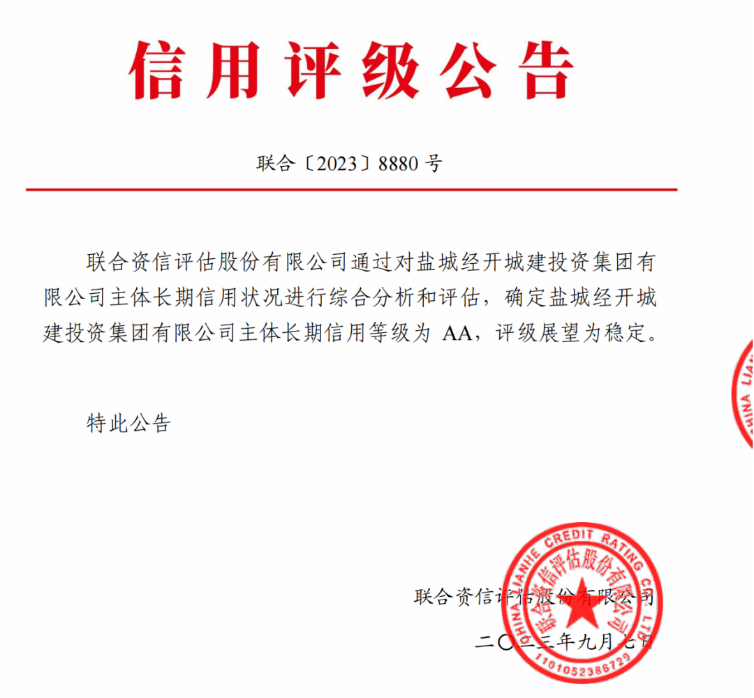 9月19日,經(jīng)中誠信國際信用評級有限責(zé)任公司(簡稱“中誠信國際”)綜合評定,鹽城經(jīng)開城投集團(tuán)成功獲評AA主體信用評級,評級展望為“穩(wěn)定”。這是集團(tuán)繼9月7日首次獲得聯(lián)合資信評估股份有限公司AA主體評級后,再次獲得頭部權(quán)威評級機(jī)構(gòu)AA主體信用等級認(rèn)定,是集團(tuán)發(fā)展歷程上的又一次重大突破。