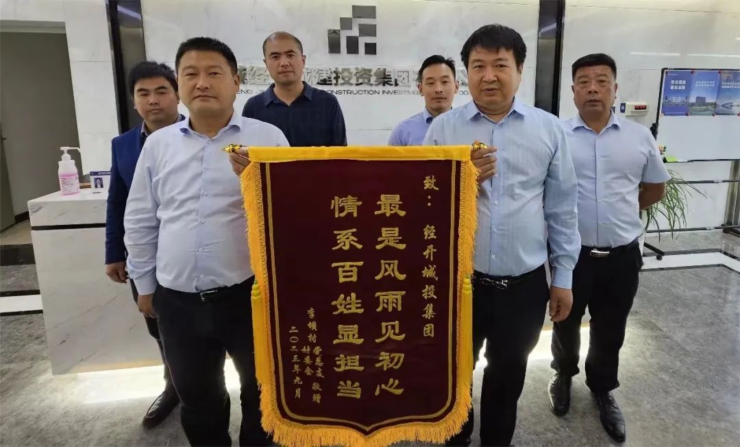 10月7日,步鳳鎮(zhèn)副鎮(zhèn)長(zhǎng)李軍一行人送來(lái)錦旗,為鹽城經(jīng)開城投集團(tuán)在仁智村、李壩村雷暴大風(fēng)天氣災(zāi)后恢復(fù)重建工作中的全力支持與幫助表示衷心感謝。