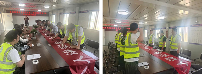 在鹽洛高速步鳳互通項(xiàng)目會(huì)議室,項(xiàng)目安全負(fù)責(zé)人結(jié)合“安全生產(chǎn)月”活動(dòng)方案要求,對(duì)“安全生產(chǎn)月”工作進(jìn)行了詳細(xì)部署;隨后,全體與會(huì)人員高舉右手,進(jìn)行了莊嚴(yán)宣誓,展示了大家對(duì)于安全生產(chǎn)工作的堅(jiān)定信念和決心,并在“人人講安全、個(gè)個(gè)會(huì)應(yīng)急——暢通生命通道”的主題條幅上鄭重署名。